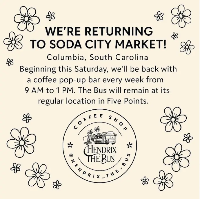 Catch Hendrick's the Bus at Soda City Market, serving up specialty coffee and good vibes in the heart of Columbia. As a local favorite, Hendrick's blends bold brews with a welcoming lounge atmosphere—perfect for fueling your weekend stroll or sparking conversation with fellow market-goers. Come for the coffee, stay for the experience.